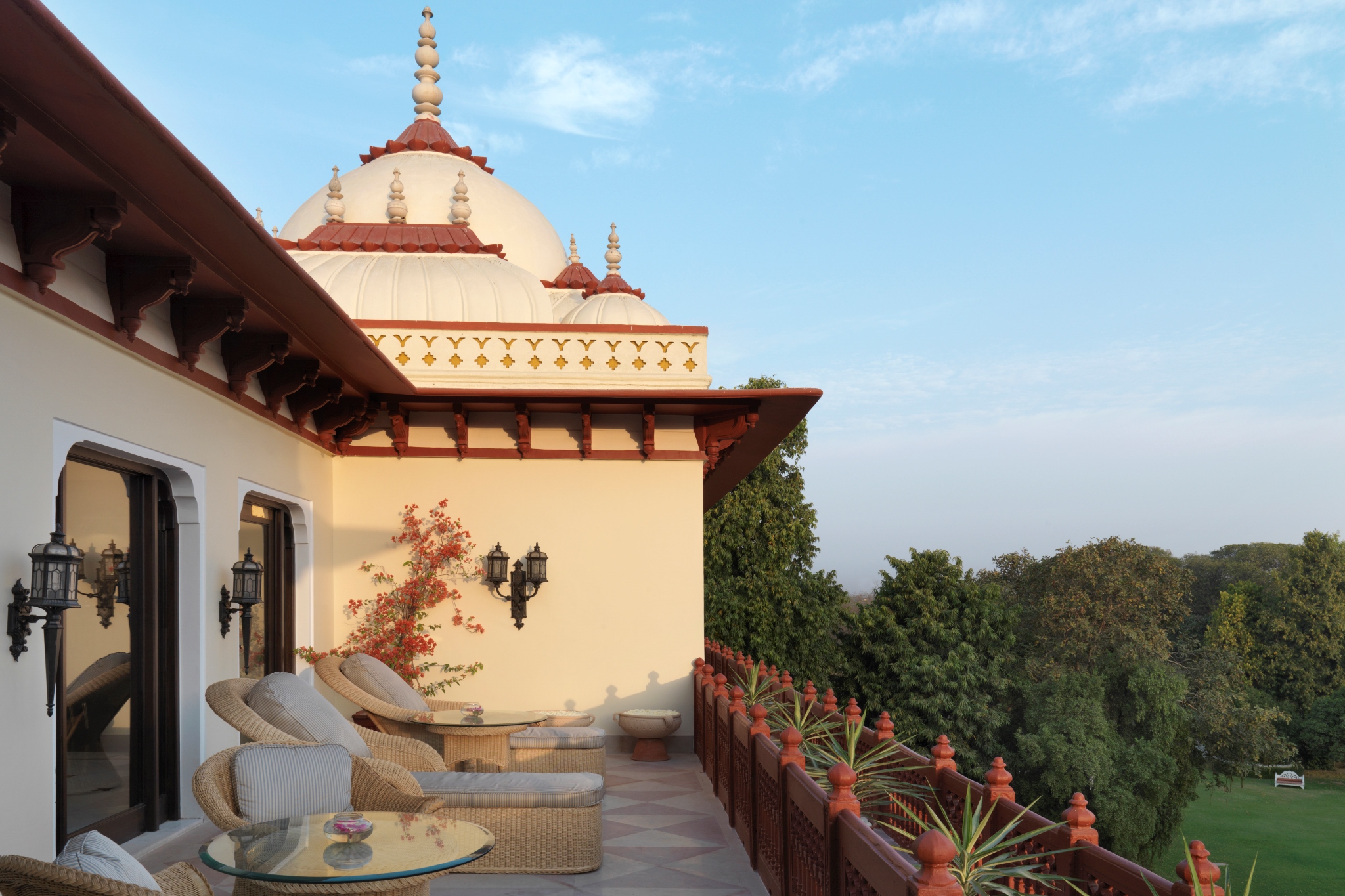 Die ehemalige Palastresidenz des Maharajas von Jaipur gilt als Traumhotel der ganz besonderen Klasse – ein architektonisches Meisterwerk. Erlesene Moghul- und Rajputen-Architektur begrüsst Sie in der stilvollen Lobby, es folgen prunkvolle Gemächer und Salons, geheimnisvoll verschachtelte Innenhöfe, leise sprudelnde Brunnen und luftige Veranden. Der anspruchsvolle Reisende geniesst gediegene Gastlichkeit, die den einst königlichen Lebensstil der Maharajas wieder aufl eben lässt. 1957 wurde das Rambagh Palace in das allererste indische Palasthotel umgewandelt, welches 1972 von der renommierten Taj-Hotelgruppe übernommen wurde.