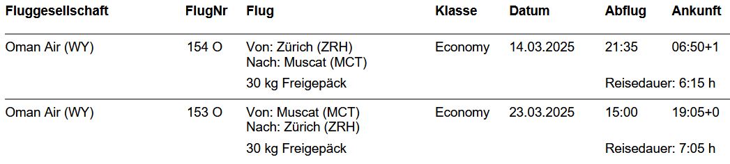 | Erläuterungen zum Grundpreis | Landpreis ab/bis Muskat: CHF 2860 pro Person Total: CHF 3’406.80