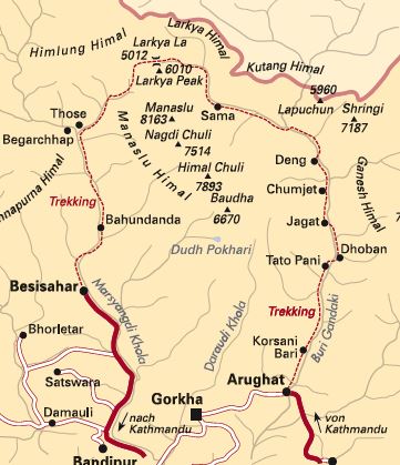 Das Manaslu-Massiv liegt ungefähr hundert Kilometer nordwestlich von Kathmandu zwischen dem Ganesh Himal und dem Annapurna Himal. Während unserem 16-tägigen Trekking auf kaum begangener Route umrunden wir den mit 8’156 Metern achthöchsten Berg der Welt. Das tief eingeschnittene Tal auf der Ostseite des Manaslu wurde von Tibet her besiedelt, und so sind auch die Dörfer stark tibetisch geprägt. Als  Höhepunkt unseres Trekkings überqueren wir den über 5’000 Meter hohen Larkya La Pass. Das Manaslu Trekking gehört zu den schönsten und interessantesten Trekkingrouten Nepals.