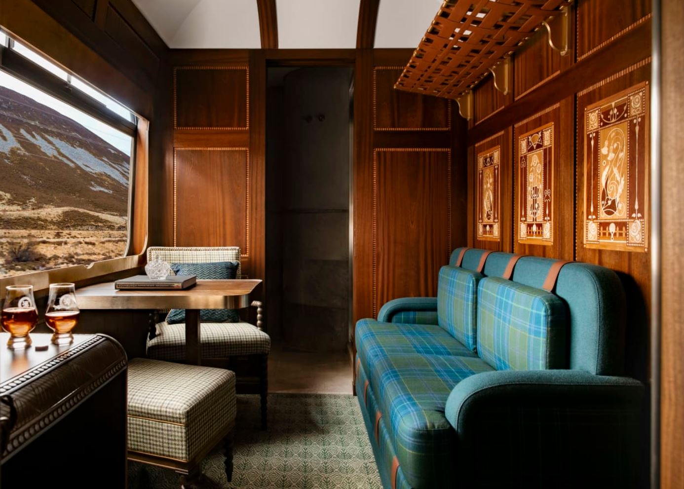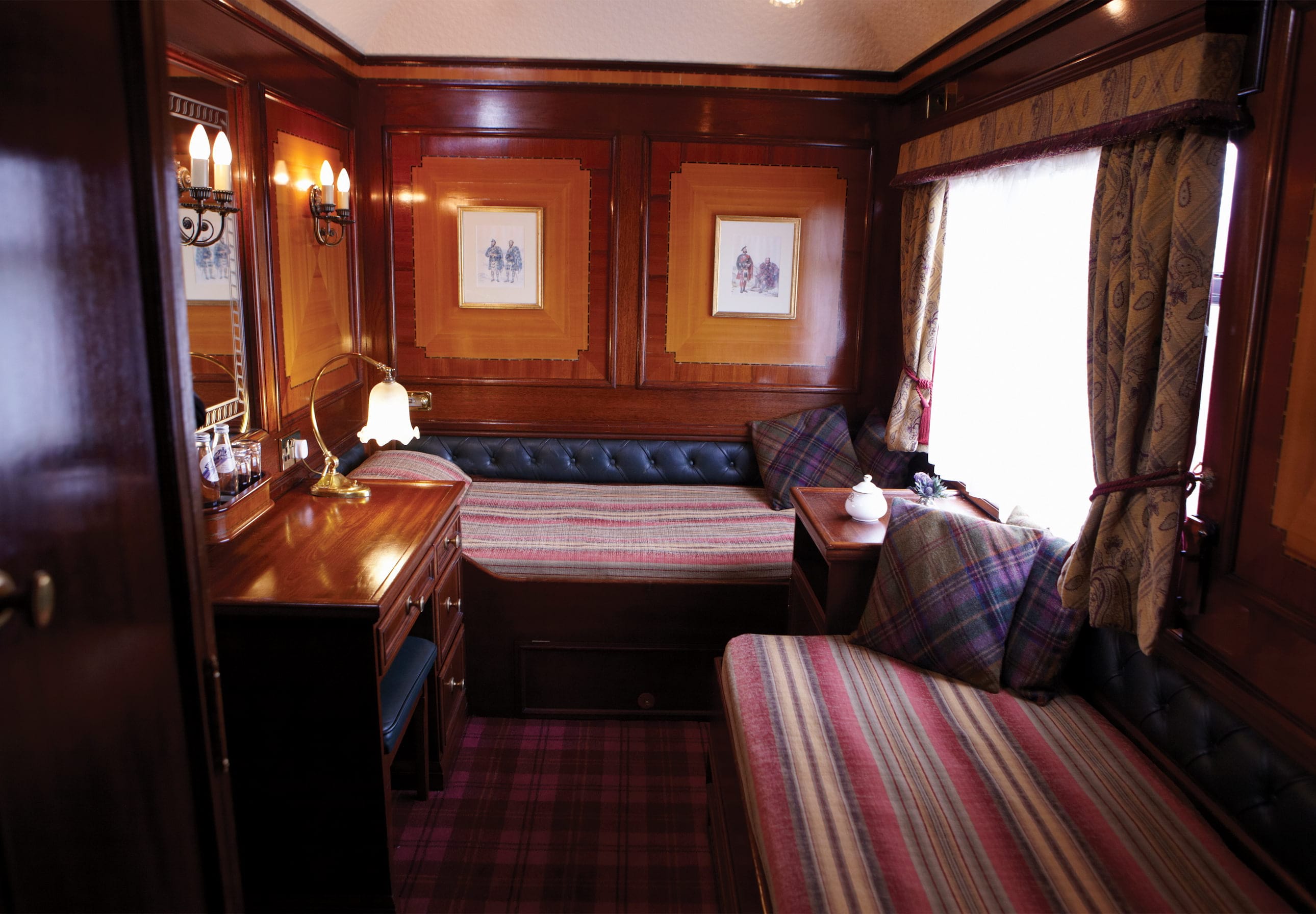 Nur 36 Passagiere nimmt der schottische Zug, der in seiner aktuellen Form erst seit 1990 auf Reisen geht und als einer der luxuriösesten Züge der Welt gilt, in opulent ausgestatteten Privatkabinen auf. Die edlen Doppel- und Einzel-Kabinen sind von Designer James Park mit Mahagoni-Täfelung, Tartan-Mustern und warmen Farbtönen im schottischen Flair der guten alten Zeit gestaltet. Neben Annehmlichkeiten wie Schminktisch, Ventilator und Klingel für den Kabinenservice besitzt jede Kabine ein eigenes Badezimmer – non-stop heisses Wasser, täglich frische extra-flauschige Handtücher und luxuriöse Toilettenartikel sind natürlich bei einem Zug dieser Klasse ein Muss. Für den Rundum-Blick auf pittoreske schottische Dörfer oder fotogene Schlossruinen besitzt der Royal Scotsman einen mit gemütlichen Sesseln ausgestatteten Panorama-Wagen, von dem aus die Gäste auch ins Freie treten können, um auf der Plattform die klare schottische Luft zu geniessen oder Sterne zu zählen.
